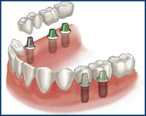 In cases where several teeth are missing, a bridge system may be used. For example, if 3 teeth are missing, 2 dental implants may be placed, and a 3-unit bridge loaded onto the dental implants. Or, if 5 teeth are missing, 3 dental implants may be placed, and a 5-unit bridge may be loaded onto the dental implants. In most cases, all of the necessary dental implants can be placed in the same visit. In cases where all of the teeth are missing on the upper or lower arch, several implants may be placed in the arch, and then a permanent denture is loaded onto the dental implants. There are several options for dentures placed on implants.