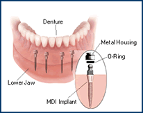 The image above is of the lower arch (jaw) MDI application, which is based on 4 implants. Since you have gravity working for you, 4 MDI implants are sufficient.